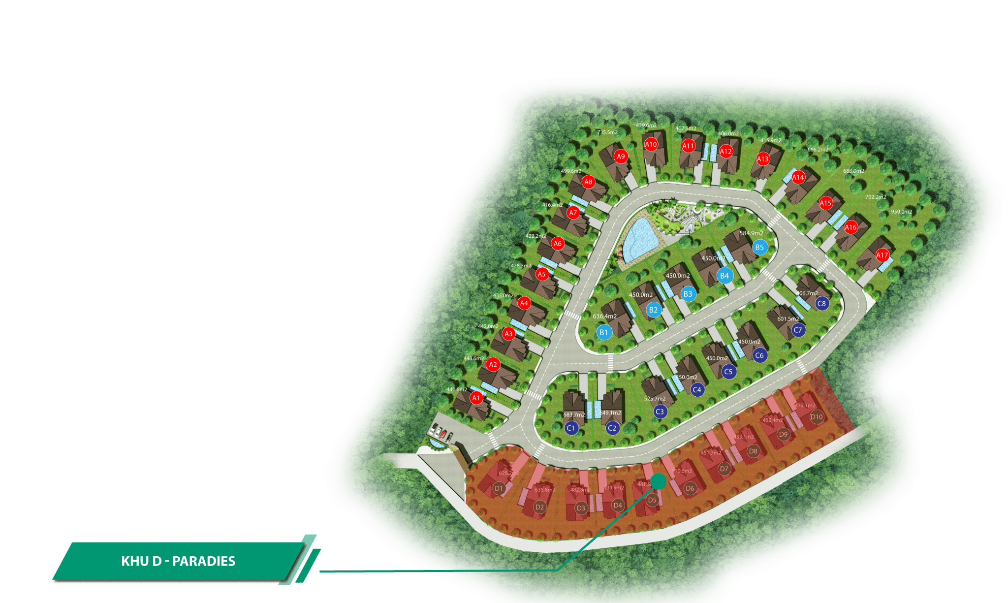 Khu Paradies hay còn gọi là khu Thiên Đường, đây là phân khu duy nhất sở hữu 2 mặt tiền – mặt tiền đường ngoài và mặt tiền đường tản bộ nội khu gồm 10 nền biệt thự liên kế
